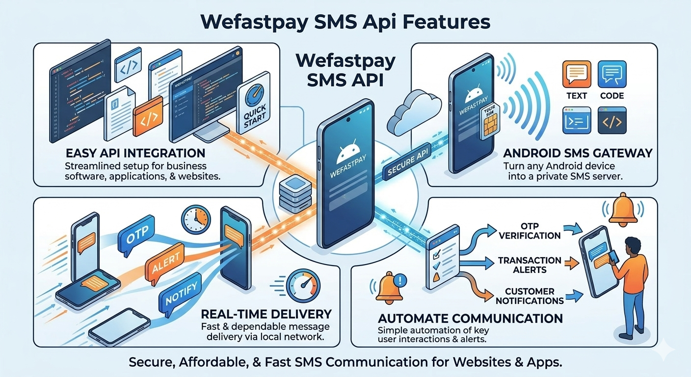 Wefastpay provides powerful tools to help businesses send SMS messages quickly and reliably. Our Android-based SMS gateway allows you to send messages directly from your mobile device using a simple API integration. With Wefastpay, you can automate OTP verification, alerts, notifications, and customer communication. The platform is easy to use, secure, and designed to deliver messages in real time using your own Android device.